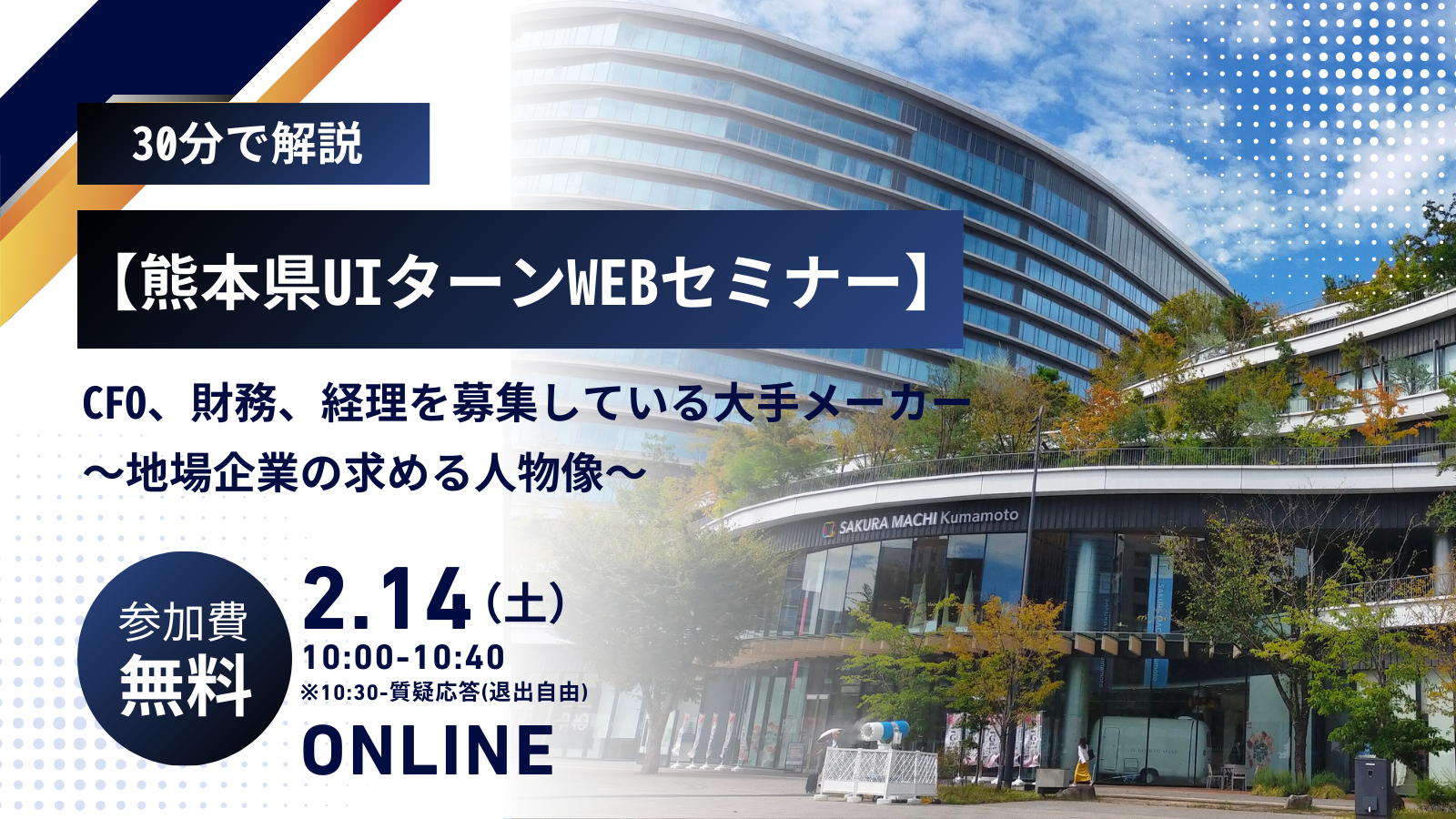 【熊本県へのU・Iターン転職オンラインセミナー】「CFO、財務、経理」を募集している大手メーカー~地場企業の「求める人物像」を30分で解説